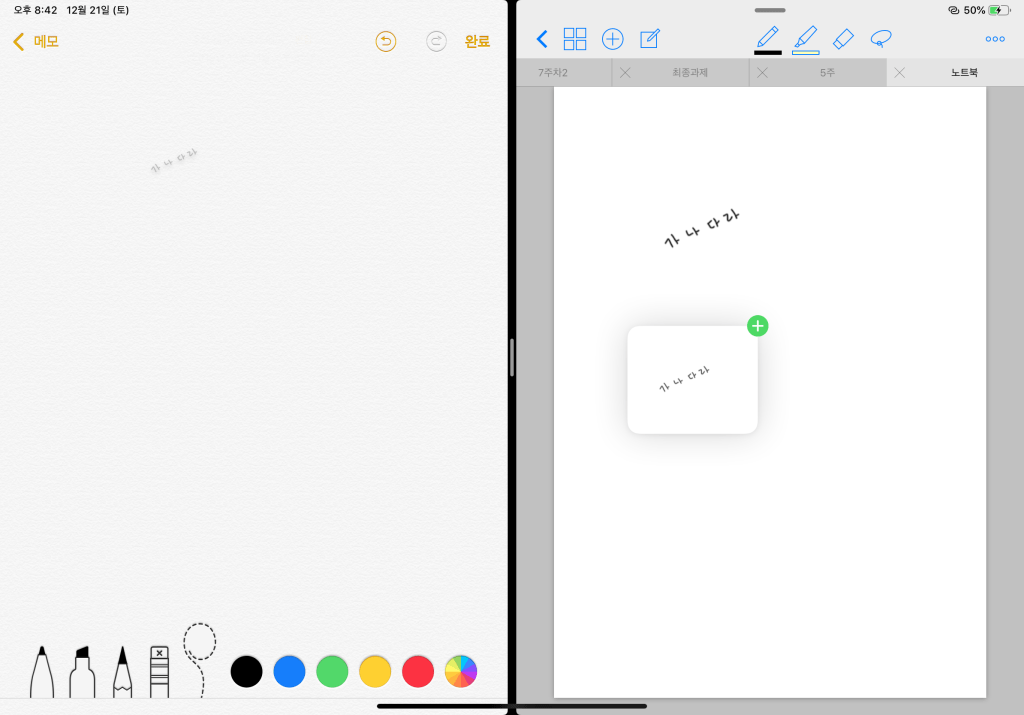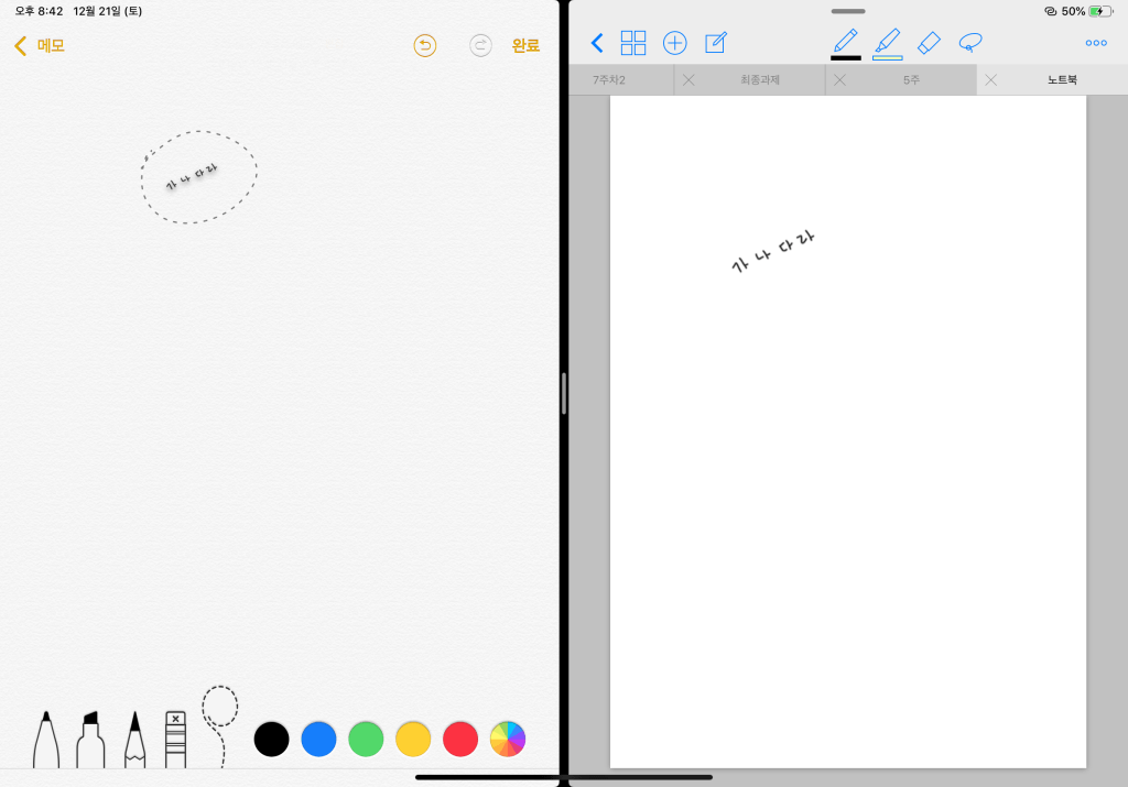 이렇게 메모를 왼쪽에 띄어 놓고 오른쪽에 제가 사용하는 메모 앱을 켜놓은 뒤
