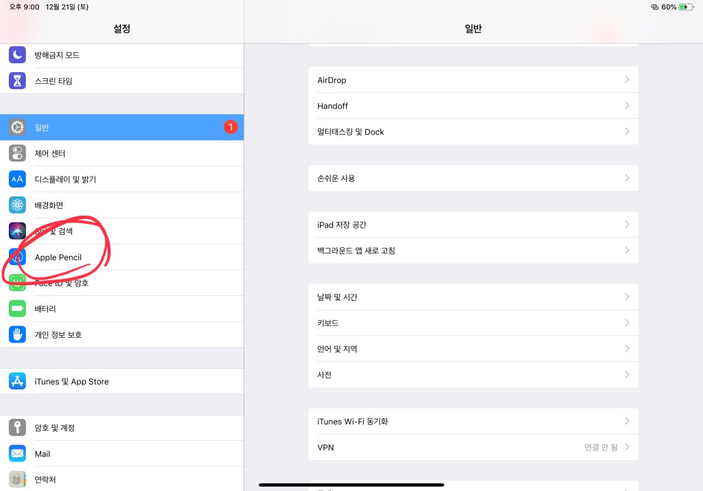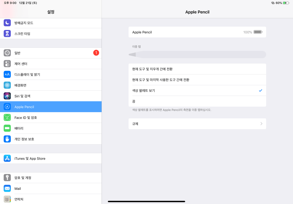 우선 설정에 들어가서 밑에 Apple pencil 을 클릭해주면